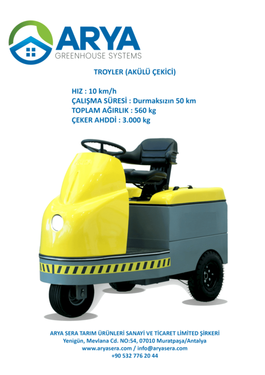 Sera içerisinde ve çevresinde ürün hasadının nakil edilmesi için kullanılan akülü bir araçtır. Akülü çekici aküleri 24Volt/300 Ah aküdür, akünün 24 Volt/300 Ah olmasının verdiği avantaj ile uzun süre şarj ve 3 ton çekiş kapasitesi sağlamaktadır. Akülü çekici arabasının Motor gücü 4.2 Kw dır. DC motor çekici ileri ve geri hareket kabiliyetine sahip olup gaz pedalından kademeli hız artışı ve rampalı duruşlar için güvenlik sistemi mevcuttur. Motor freninin yanında hidrolik destekli fren ve el freni mevcuttur. Akülü aracımız korna, ışık gibi donanıma sahiptir ve istediğiniz donanım ile imal edilmektedir. Akülü römork çekicinin akü ile hareket verilmesinin ana nedenlerinden birisi de sera içindeki ürünlerin gaz salınımı ile zarar görmesini engellemektir. Akülü römork çekici 8 Saatlik şarj ile en az 10 saat kullanım sağlayan araçlarımız isteğe göre üretilen her ebatta römorka bağlanabilmektedir